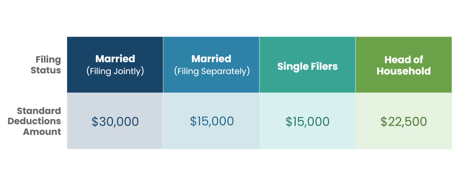 From adjusted gross income, deductions are subtracted. With deductions, taxpayers have two choices: the standard deduction or itemized deductions. The standard deduction amount varies based on filing status, as shown on this chart: