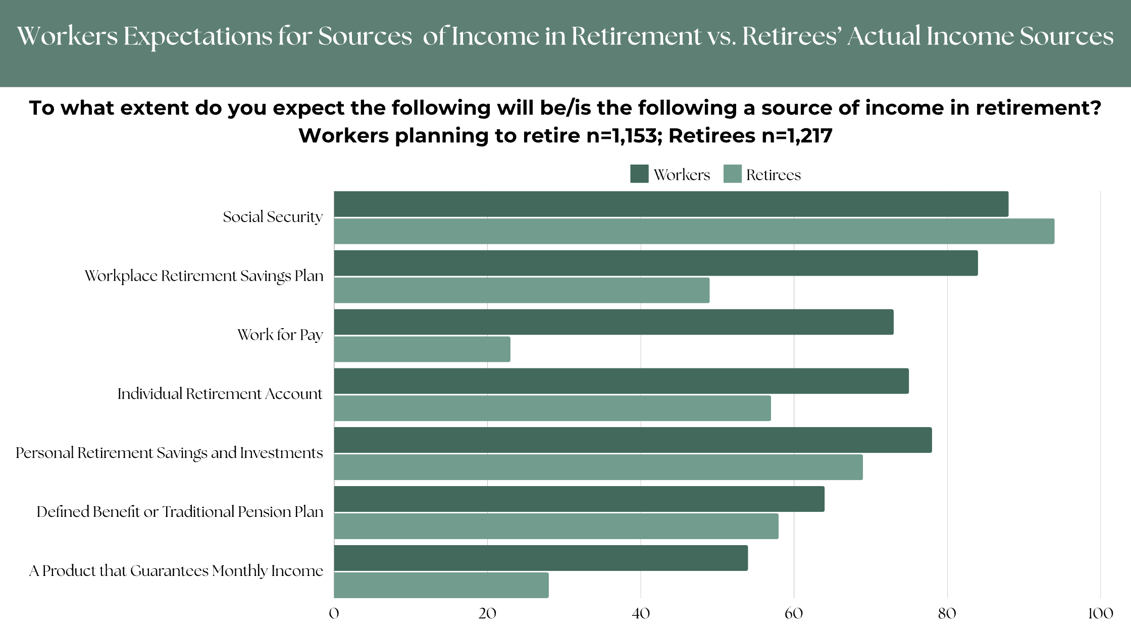 What workers anticipate in terms of retirement income sources may differ considerably from what retirees actually experience.